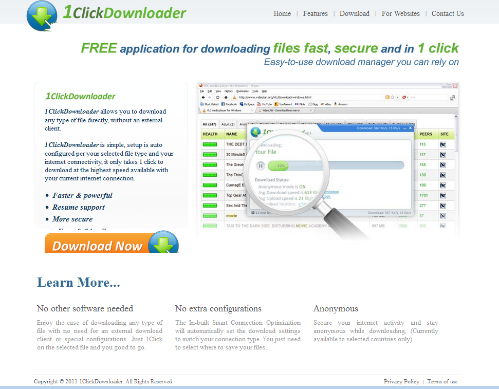 The shortcut links on the interfaces point to ww1[DOT]1clickdownloader[DOT]com, which is currently a parked domain. As such, users can’t find the “Terms of Use” or “Privacy Policy” pages. The said URL is also on their Facebook page. Quite notably, it hasn’t been updated since the second half of 2012.