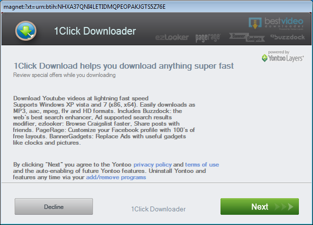 Supports Windows XP vista and 7 (x86, X64). Easily downloads as MP3, aac, mpeg, flv and HD formats. Includes Buzzdock: the web’s best search enhancer. Ad supported search results modifier, ezlooker: Browse Craigslist faster. Share posts with friends. PageRage: Customize your Facebook profile with 100’s of free layouts. BannerGadgets: Replace Ads with useful gadgets like clocks and pictures. As you can see, apart from the downloader (the main program), it also offers to install other software that users may be interested in checking out.