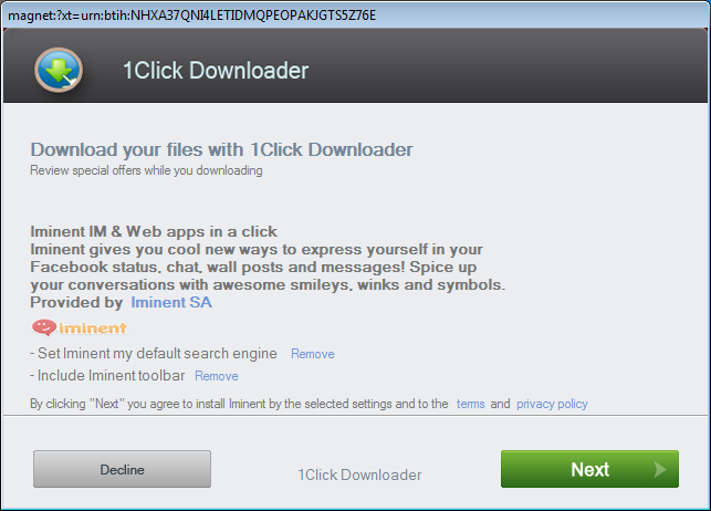 Iminent gives you cool new ways to express yourself in your Facebook status, chat, wall posts and messages! Spice up your conversations with awesome smileys, winks and symbols. This OneClickDownloader sample (detected as PUP.Optional.OneClickDownloader) installs files that we detect as PUP.Optional.Iminent, PUP.Optional.Yontoo, and PUP.Optional.SweetIM.