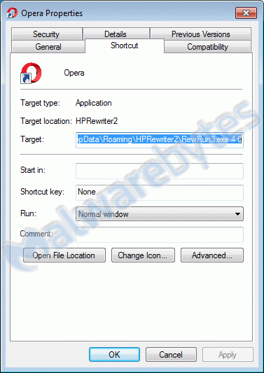 The target of the shortcuts is altered to C:Users{username}AppDataRoamingHPRewriter2RewRun3.exe {version number} as shown in the example below.