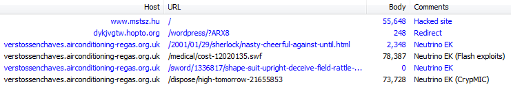 In an added twisted, if you visited the Hungarian website directly, you would be redirected to the Neutrino exploit kit and get infected with the CrypMIC ransomware. This is a good example of the multiple ways criminals can monetize a hacked site. It is quite likely in this case that the site was hacked several different times in unrelated automated attacks, perhaps even via the same vulnerability.