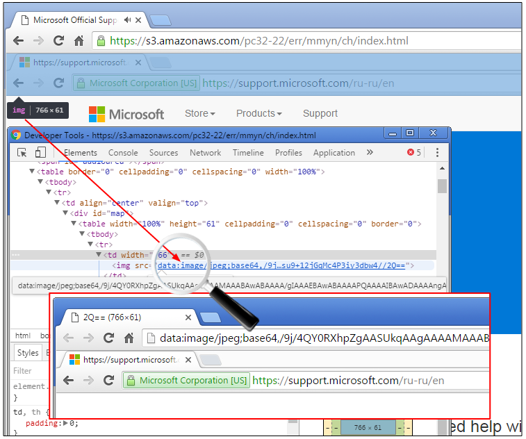 Let’s have a look under the hood to find out exactly how they are pulling this one. We notice that the address bar is nothing but a JPEG picture that is placed at the right spot to look like an actual address bar when the page is loaded in full-screen mode. To make matters more confusing this particular scam is hosted on Amazon, and that is the correct address bar.