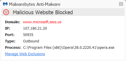 The domain aios[dot]us that hosts several Tech Support Scammer sites is blocked for users of Malwarebytes Anti-Malware Premium that have the Malicious Website Protection enabled.