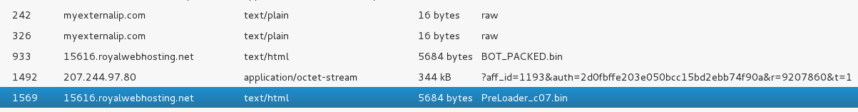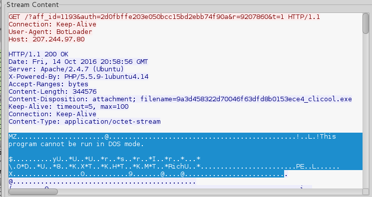 The bot also downloads an additional payload (in the particular session it was: 47d9e7c464927052ca0d22af7ad61f5d) without encrypting the traffic:
