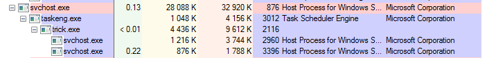 When we observe the execution of the malware via monitoring tools, i.e. ProcessExplorer, we can find it deploying two instances of svchost: