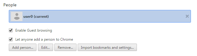 A gray icon with the profile name “user0” is displayed as the current user. Your extensions and history were copied to this account, but your start-page has been changed to