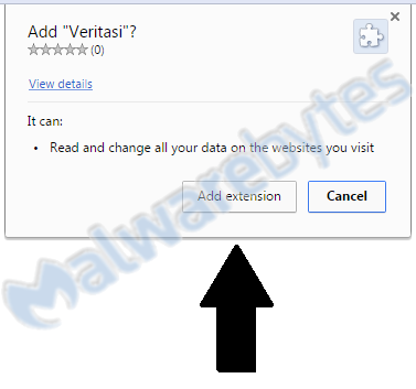 The app is called Veritasi and a big arrow pointing to the “Add extension” button is displayed on the site. Clicking the said button initiates the installation of the app.