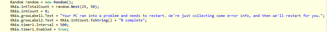 When you are first confronted with that blue screen, you can’t help but wonder what will happen when the completion percentage value reaches 100%. But looking at the code that controls this, full completion never happens. Because that’s all it is: a counter. Random random = new Random(); this.intTotalCount = random.Next(25, 50); this.intCount = 0; this.growLabel1.Text = "Your PC ran into a problem and needs to restart. We're just collecting some error info, and then we'll restart for you."; this.growLabel2.Text = this.intCount.ToString() + "% complete"; this.timer1.Interval = 500; this.timer1.Enabled = true;