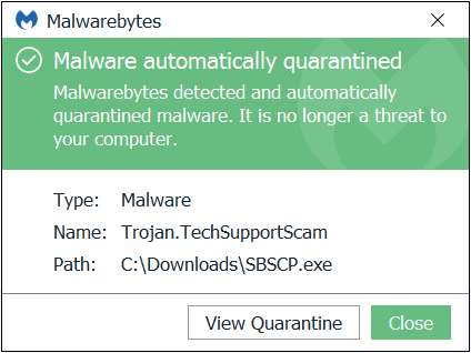 Malwarebytes detected the executable as Trojan.TechSupportScam.