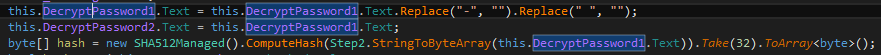 Looking at the decrypter code we can confirm that each file is encrypted using AES in CBC mode. The AES key is 32 byte long, and it is the taken from the beginning of SHA512 hash of the password.