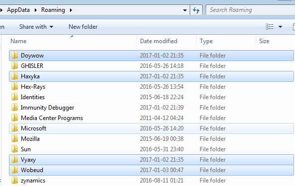 In addition to the content dropped in %TEMP%, we can see some new folders with random names created in %APPDATA%: