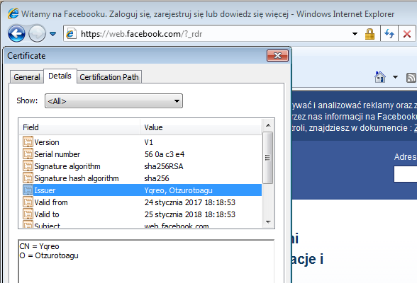 It is easy to guess that this malware targets web browsers. Indeed, if we run a browser and try to visit some site over HTTPS, we will see that the original certificates are replaced by the malicious one. See examples below – draw attention that the subject of the certificate contains the valid domain – only the issuer field can let us recognize, that the certificate is not legitimate: