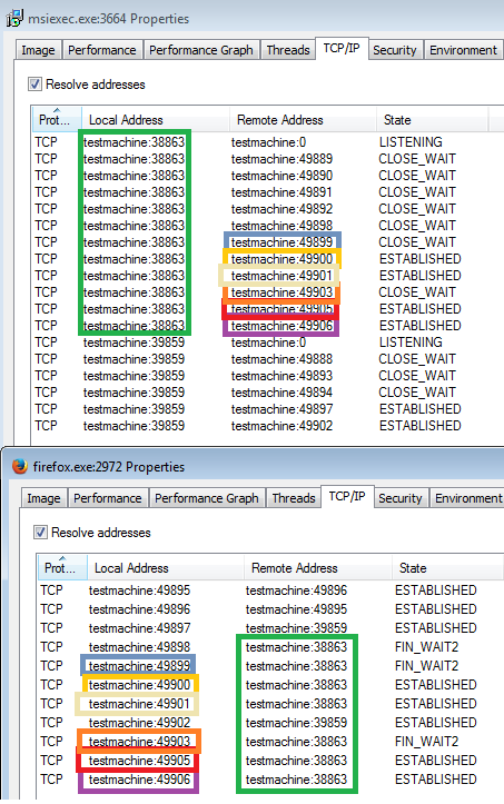 The main module injected into msiexec opens local TCP sockets that are used to communicate with the module injected into browser.