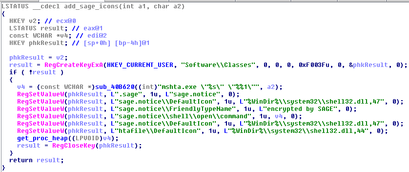 Interesting and uncommon feature deployed by Sage is the change of icons for the used datatypes. Padlock icon is added to the encrypted files with the .sage extension and the key icon is added to the files with .hta extensions (that are used for the ransom notes). Icon change is implemented via setting appropriate registry keys: