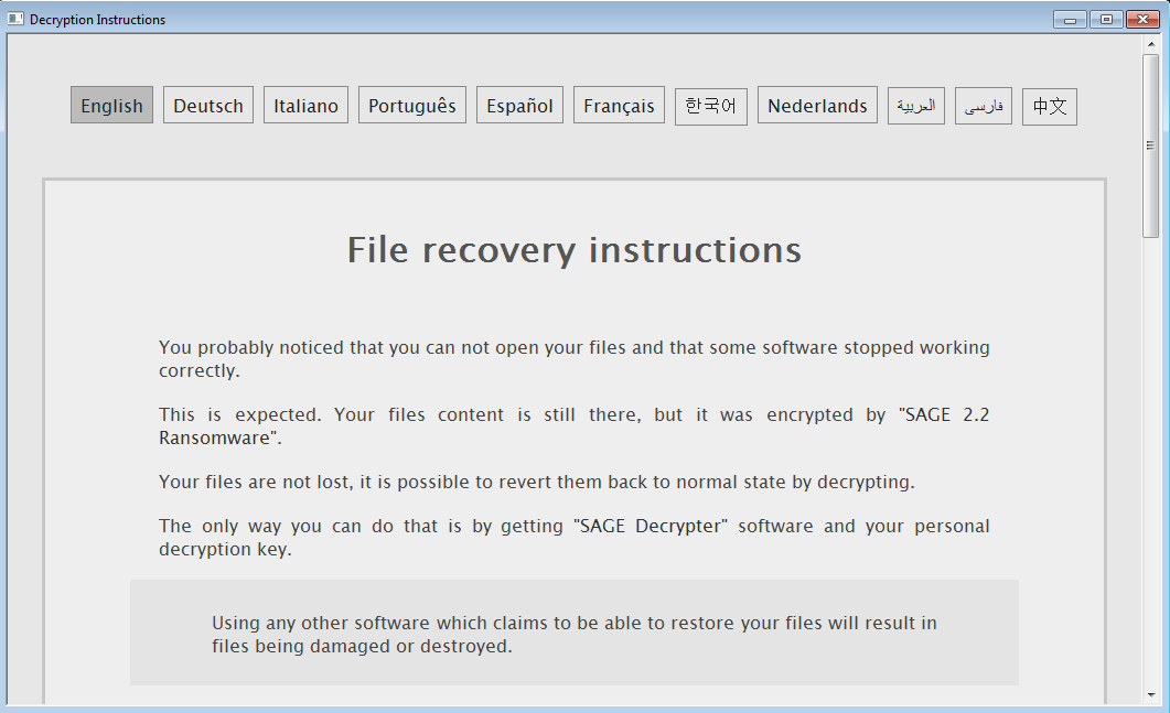 Sage, similar to Spora, uses a complex way of deriving keys. So far, there is no solution that would allow recovering files without paying the ransom – that’s why we recommend focusing on prevention instead.Appendix https://blog.fortinet.com/2017/02/02/a-closer-look-at-sage-2-0-ransomware-along-with-wise-mitigations – Fortinet about Sage 2.0