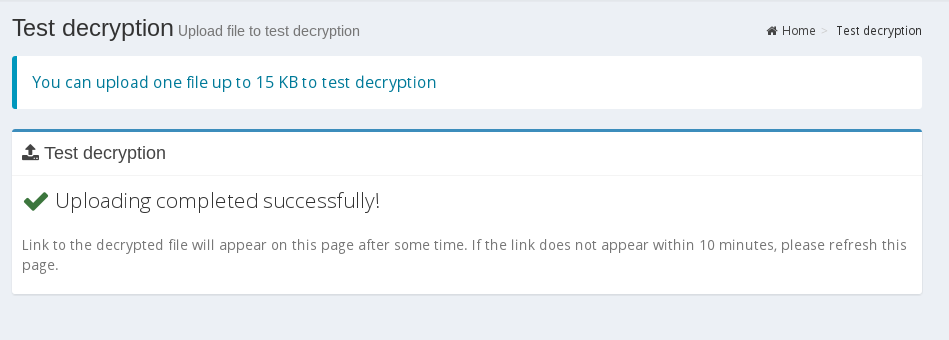 The malware allows to test decryption capabilities by permitting the victim to upload some encrypted files (the size of the file must be lesser than 15 KB):
