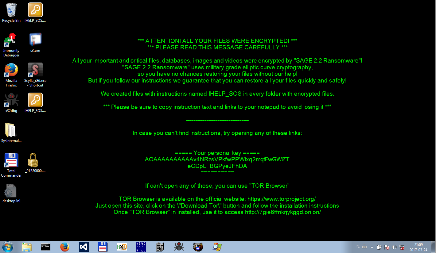 Sage is yet another ransomware that has become a common threat nowadays. Similarly to Spora, it has capabilities to encrypt files offline. The malware is actively developed and currently, we are facing an outbreak of version 2.2. of this product.