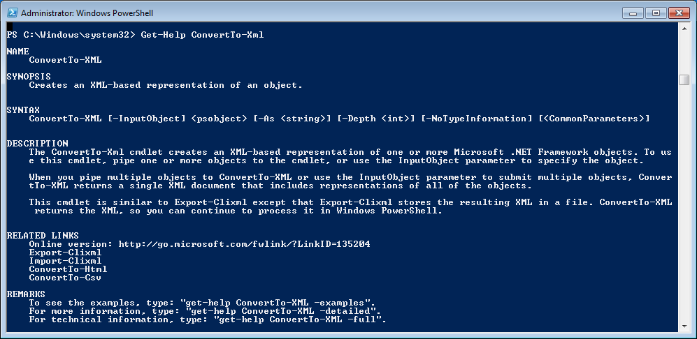 Windows PowerShell uses a verb-noun pair for the names of cmdlets and their derived classes. This makes it easy to understand what to expect. For example, if we look at the cmdlet ConvertTo-Xml it should be clear enough to figure out what will happen when you use it. And for cmdlets that aren’t so clear, or when you’d like to know more about the cmdlet or its syntax you can use the Get-Help cmdlet.