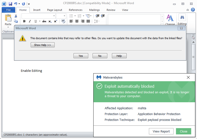 While macro-based documents and scripts make up for the majority of malspam attacks these days, we also see some campaigns that leverage documents embedded with exploits. Case in point, we came across a malicious Microsoft Office file disguised as a CP2000 notice. The Internal Revenue Service (IRS) usually mails out this letter to taxpayers when information is incorrectly reported on a previous return.