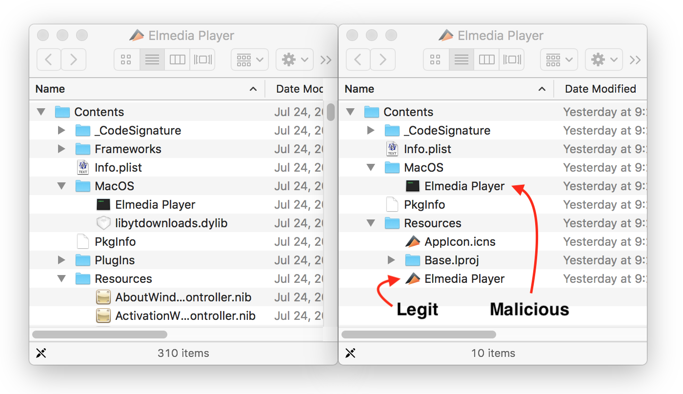 In the following screenshot, you can see the contents of the legitimate Elmedia Player app in the lefthand window, compared to the malicious wrapper app on the right.