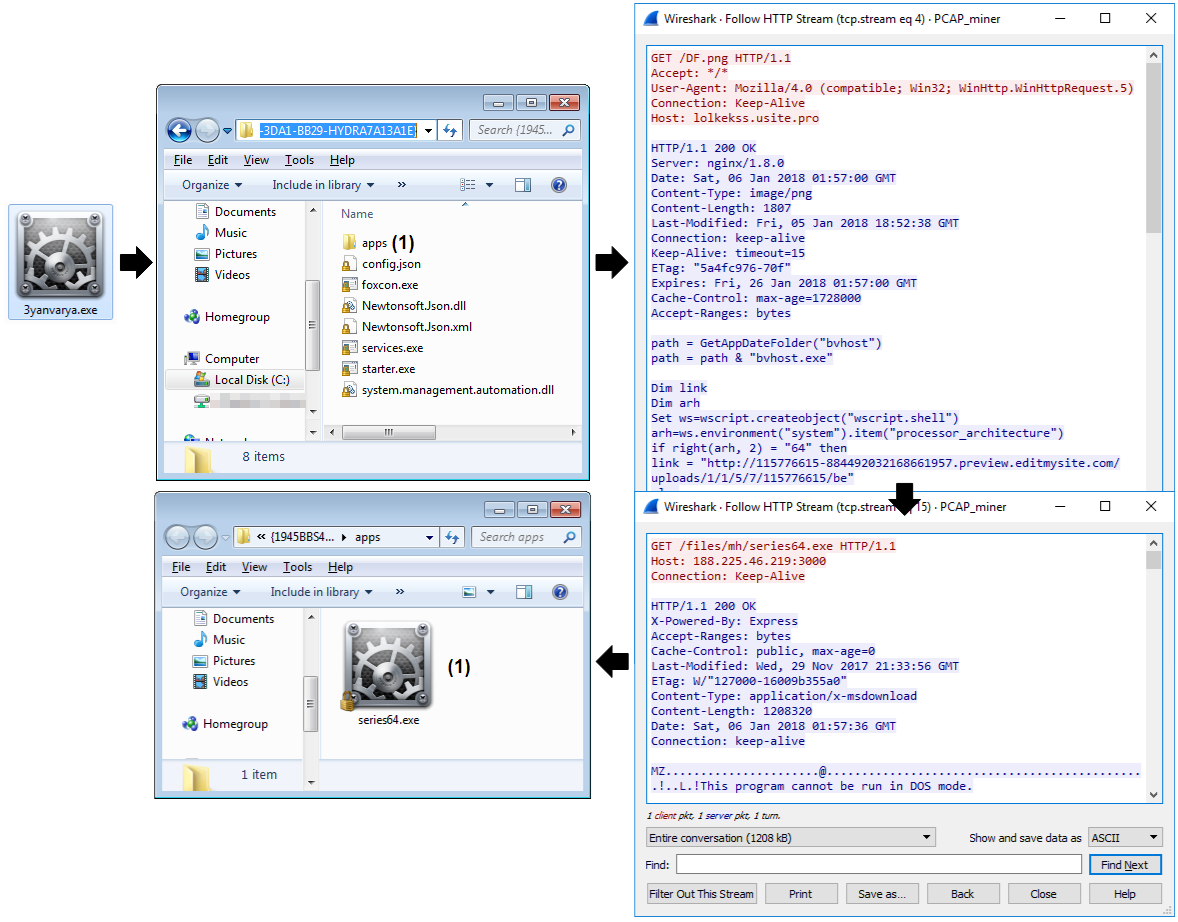 Finally, the Monero miner (series64.exe) is retrieved and can start the mining activity. The overall process can be summarized in the diagram below.