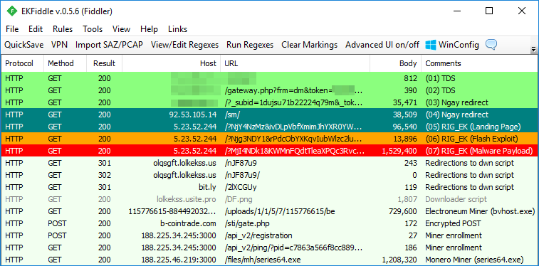 Infection flow showing redirection to RIG EK, followed by coin miner payloads