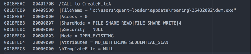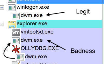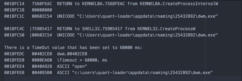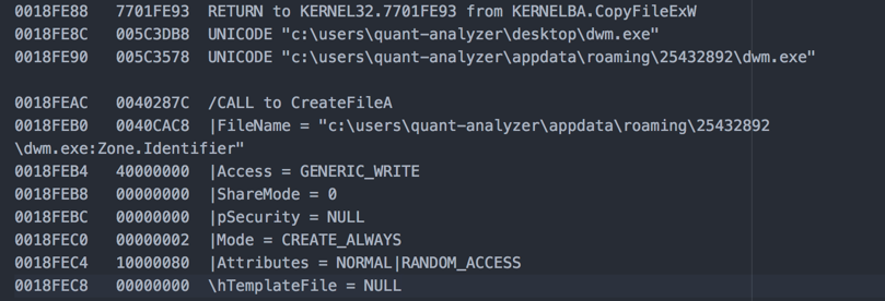 As you can see above, the process spawns a new process after it has successfully copied itself to a different location. It is important not to confuse it with dwm.exe, a legit Windows process (Desktop Window Manager). Note that the persistence mechanism has also been initiated.
