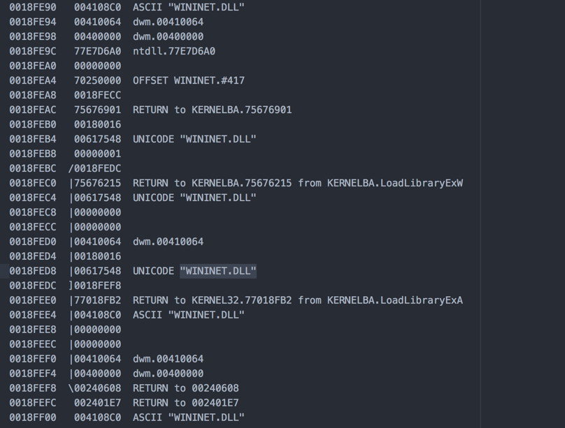 Once the process has been successfully launched, we want to look at the next important step. It will call the WININET dll to start establishing a connection back to the admin.