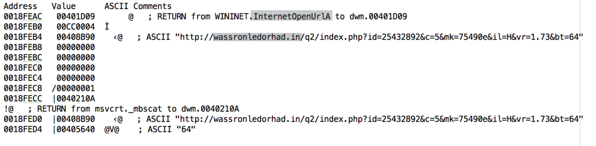 And let’s have a look at the memory in parallel. You can see that the URL has been successfully loaded, and is ready to be called upon, using the URLDownloadToFile call.