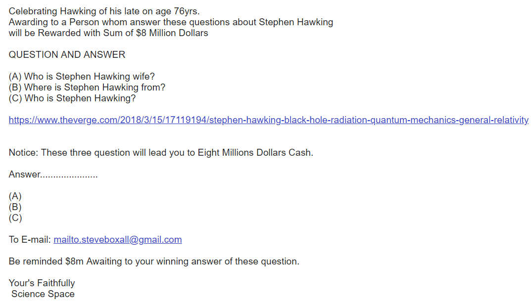 Thanks, “Science Space,” if that really is your name (because Stephen Hawking certainly isn’t). They will, of course, go on to call themselves “Scientist Space” a little later on in the mail chain because accuracy and consistency don’t appear to be a concern for our Hawking-themed scammers. Bad for them, and good for us, as you now have a few more peculiar aliases to add to the pile of “This is most definitely the fakest thing I’ve seen since last Wednesday.”
