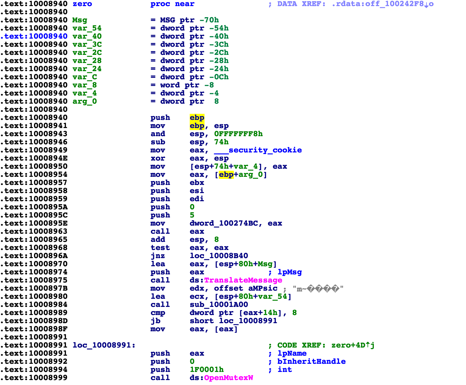 Two candidates here for the breakpoint are TranslateMessage and OpenMutexW. I didn’t have luck with TranslateMessage, so I now try OpenMutexW.
