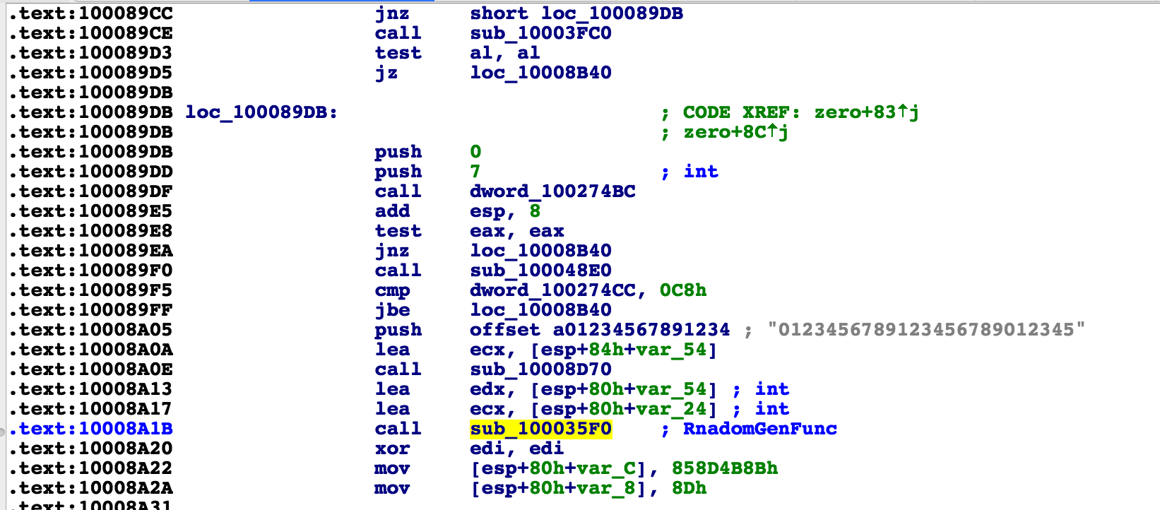 I come across this function which is highlighted. I have commented it as RandomGenFunc. It takes as a parameter in edx, the variable which was used below to generate the key. So hopefully this is where the variable gets populated and the random password string gets created.