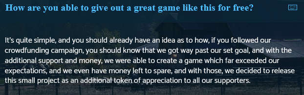 How are you able to give out a great game like this for free?…if you followed our crowdfunding campaign, you should know that we got way past our set goal, and with the additional support and money, we were able to create a game which far exceeded our expectations, and we even have money left to spare, and with those, we decided to release this small project as an additional token of appreciation to all our supporters