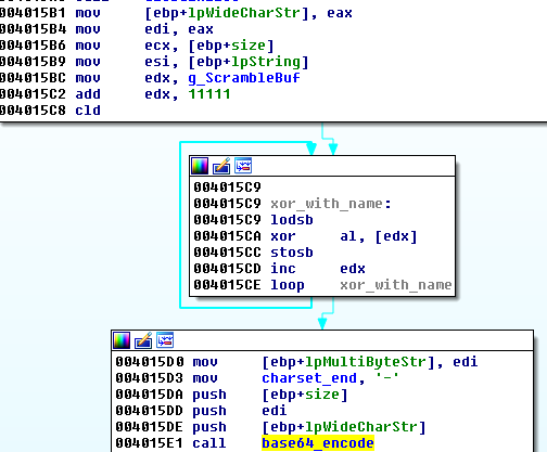 The names of the files are first XORed with the pad buffer, and then base64 encoded. The offset of the XOR key is 1111 characters from the beginning of the buffer.