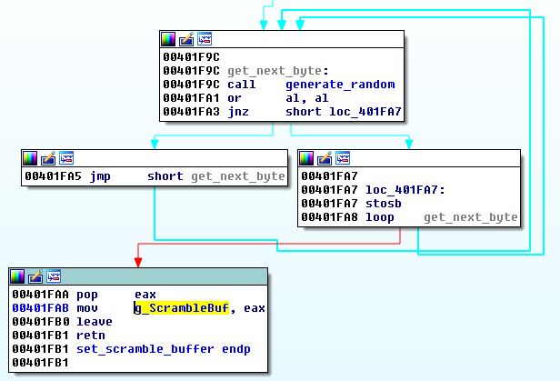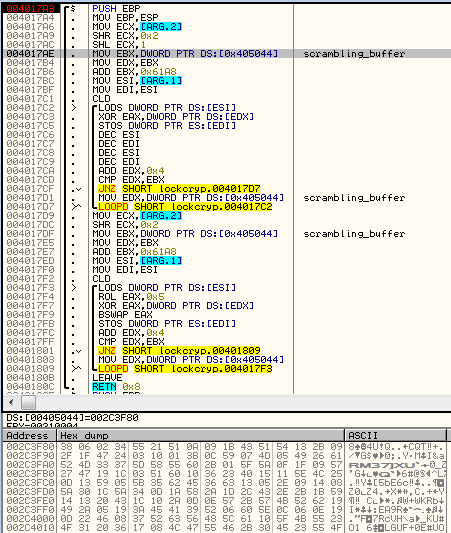 Looking inside this function, we could now understand the role of the mysterious buffer of bytes seen during the behavioral analysis. The downloaded buffer is validated by its CRC32 checksum. Then, it sets in a global variable for the further use of the encryption routine.