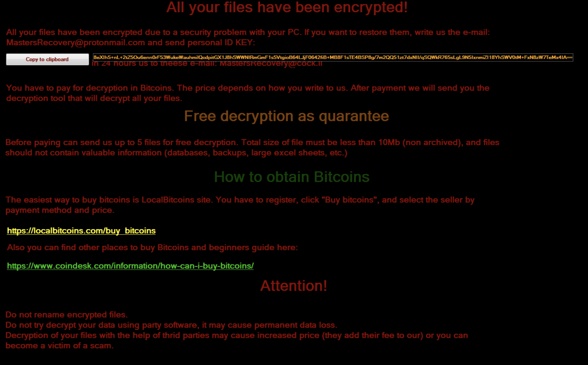 This key is saved and used to encrypt every single file, meaning that two identical files will have the same cipher-text. The AES key is encrypted with a RSA key embedded in the file. The cipher-text is encoded and shown to the user in the ransom note.