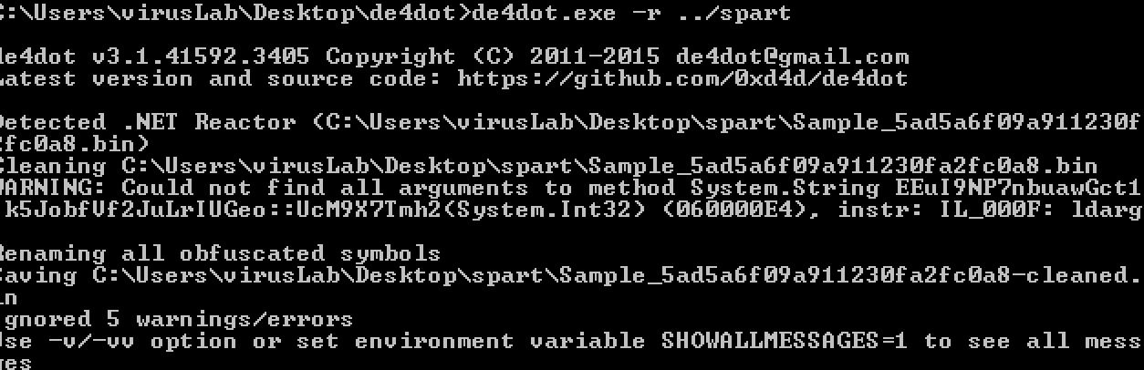 The code of the functions is not visible and as you can see, everything is obfuscated. In these scenarios, I like to use a tool called de4dot. It will process the file and output a clean readable version. The -r flag is where you set the directory, which contains the obfuscated .NET sample.