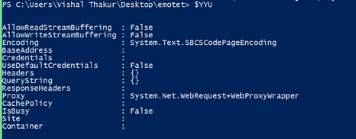 This variable is assigned the value “(new-object) System.Net.WebClient,” which will be used later with DownloadFile to download content from the Internet with the specified URI and save it as a local file. We can have a look at the value assigned to the variable in the image below. These are the attributes that will be used to start the download of the payload.