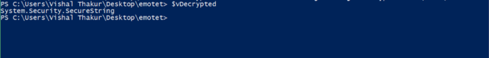 The next step now is to convert the encrypted data into SecureString by running it through ConvertTo-SecureString function. We will use the key that we found hard-coded into the malware code. We will pass the output to the variable vDecrypted:
