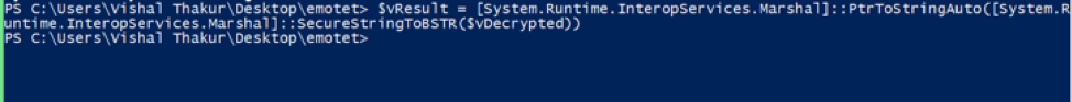 Now, the final step to decrypt the data is to Marshal it through SecureStringToBSTR and pass the output to a variable, in this case, vResult: