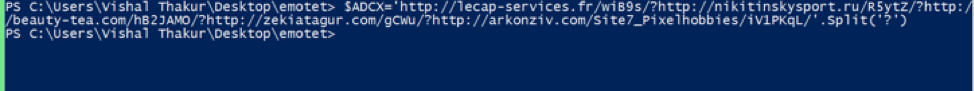 We will further execute the code to extract the payload URLs and print them to console in a clean and nice way. As we can see in the code, variable $ADCX holds the URLs. We will use the split function as shown in the decrypted code and pass the output to $ADCX.