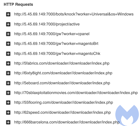 The bot proceeds to report the infected computer is ready for a new task via a series of HTTP requests announcing itself and then receiving instructions. You can see below how the bot will attempt to brute force Magento sites leveraging the /downloader/directory point of entry: