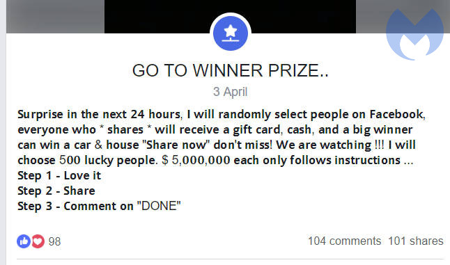 Surprise in the next 24 hours, I will randomly select people on Facebook, everyone who *shares* will receive a gift card, cash, and a big winner can win a car & house “Share now” don’t miss! We are watching!!! I will choose 500 lucky people, $5,000,000 each only follows instructionsStep 1- Love it