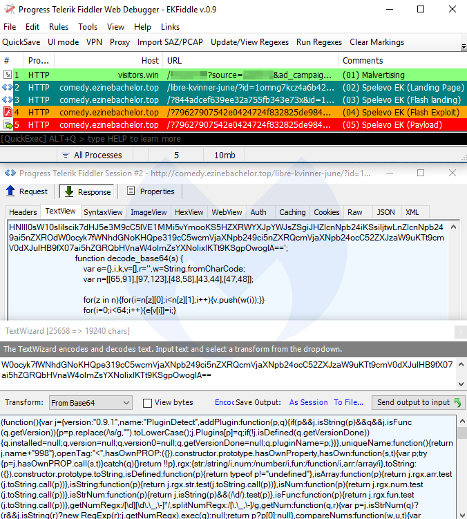 RIG EK is also one of the popular exploit kits enjoying a wide distribution via malvertising campaigns, such as Fobos. RIG still uses Flash’s CVE-2018-4878, which comes with its own artifacts.