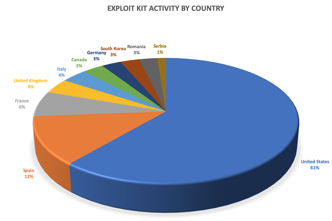 According to our telemetry, the US is by far the country most affected by exploit kits, while Spain and South Korea are leading in Europe and Asia, respectively.
