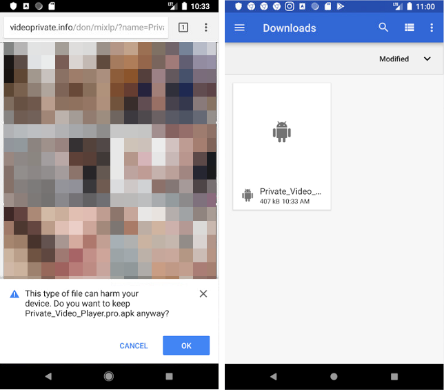 Once we switch to a mobile User-Agent and Android in particular, we can see a lot more activity and a variety of redirects. For example in one case, we were served a bogus adult site that requires users to download an app in order to play the videos: