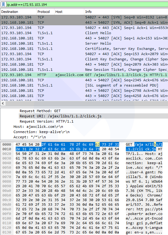 In order to find out more about the data this application may be requesting or sending to ajaxclick[.]com, we inspected the network traffic and in particular any communications with the 172.93.103[.]94 IP address. The interesting bit is this HTTP GET request that retrieves a JavaScript file (click.js) from the aforementioned domain name.