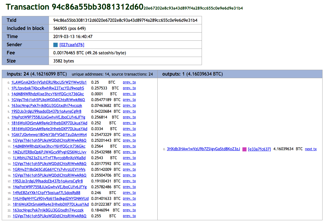 This TXID also contains 23 additional inputs from other Bitcoin addresses, which are likely also under the control of the same actor(s) behind the sextortion campaign, to 3HXdb3HAw1wVzU9b7ZSigvGaStd8KoZ3zJ. Naturally, all BTC values from these inputs were combined, totaling 4.16039634 BTC (approximately US$16,100 at time of investigation).