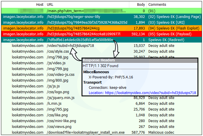 Recently, we captured an unusual change with the Spelevo exploit kit where, after an attempt to trigger vulnerabilities in Internet Explorer and Flash Player, users were immediately redirected to a decoy adult site.